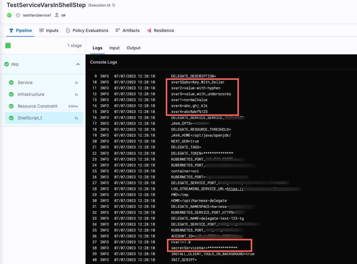 Once you enable this setting, a service's variables are available as Bash variables in any Shell Script step in a stage that deploys that service. You can access the service variables like you access any Bash variables. For example, the service variable, var1 is available for use in a Shell Script step as $var1.