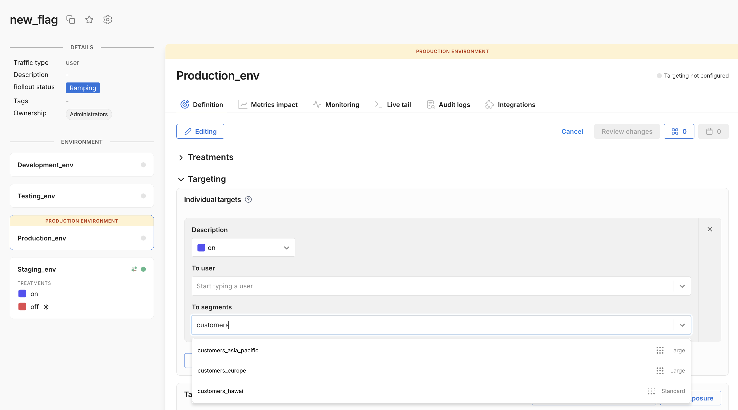 Segments are lists of user IDs. On your feature flag Definition tab, you can create targeting rules that assign treatments to segments.