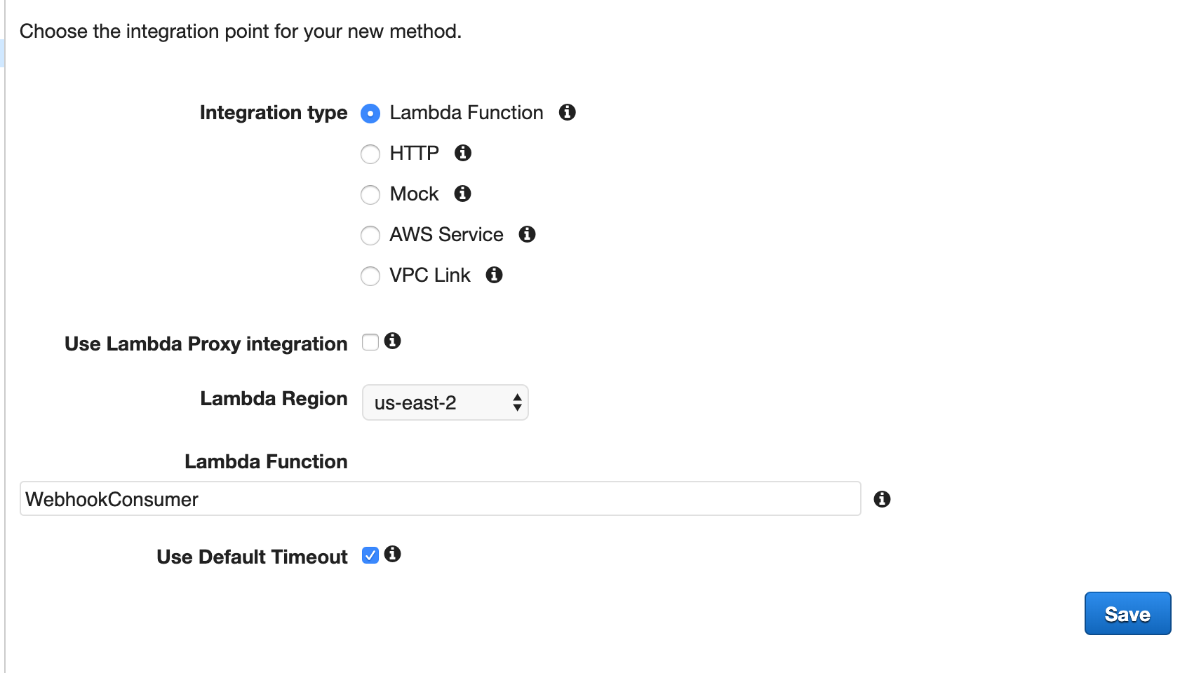 Actionslist to add a POST Method Execution, select Lambda Function for the Integration type, and type the Lambda function name created previously.