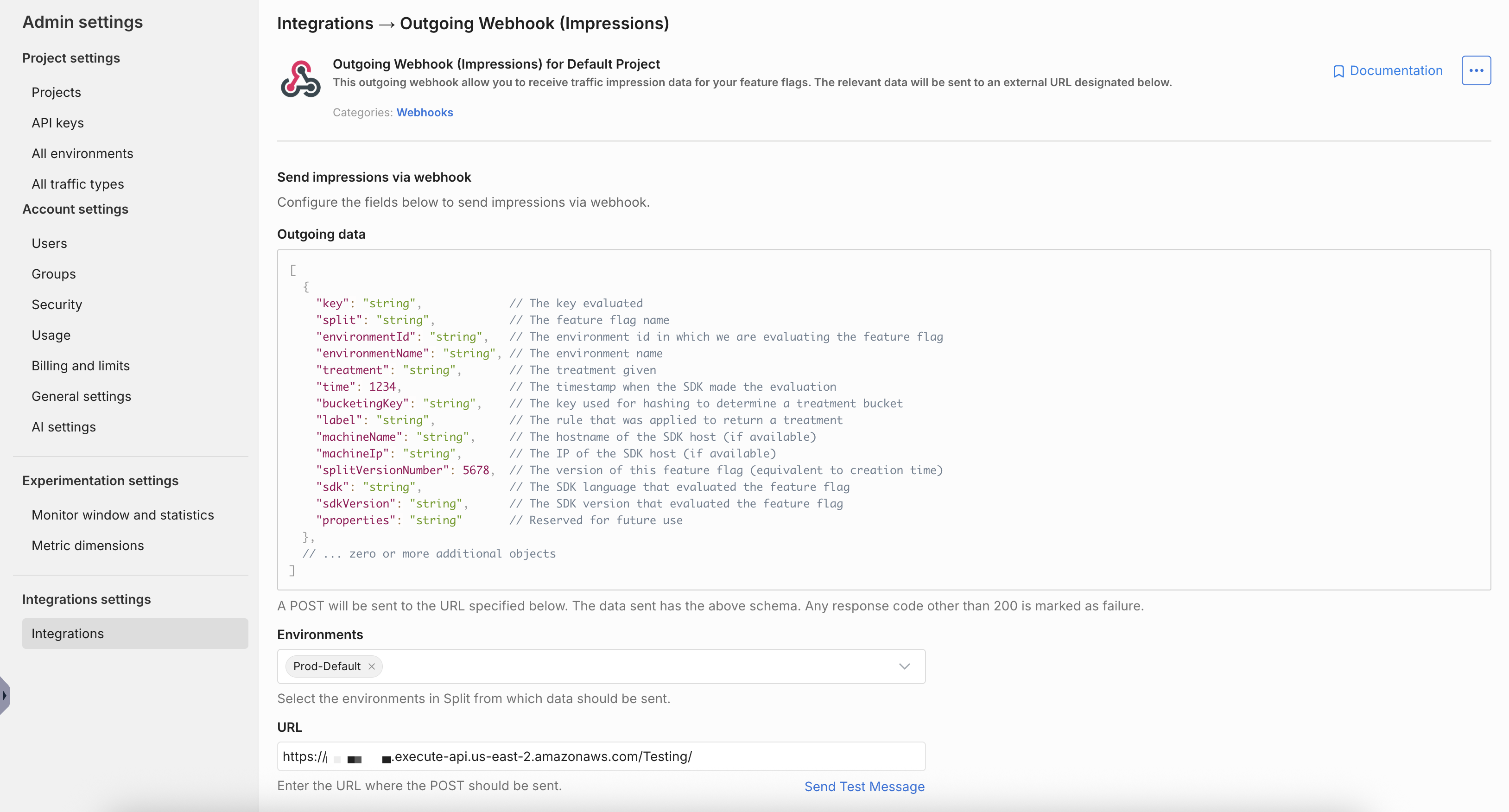 Your Webhook service is ready now, login to the Split user interface, go to Admin Settings, click on Integrations, and click the Add button for Outgoing Webhook (Impressions).