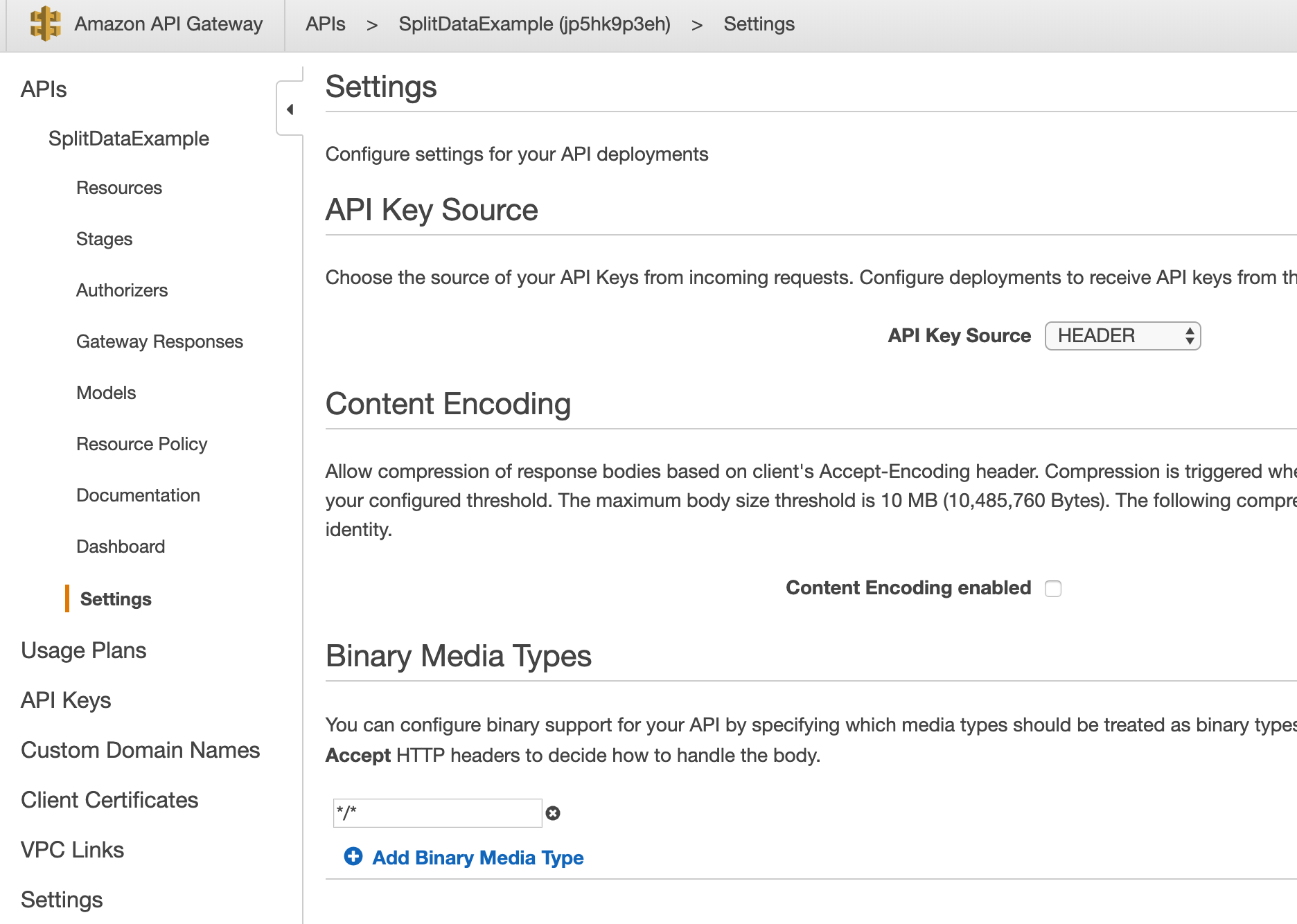 Since Split zip the post body when calling the Webhook, we need to enable binary type for our API Gateway, under Settings, add