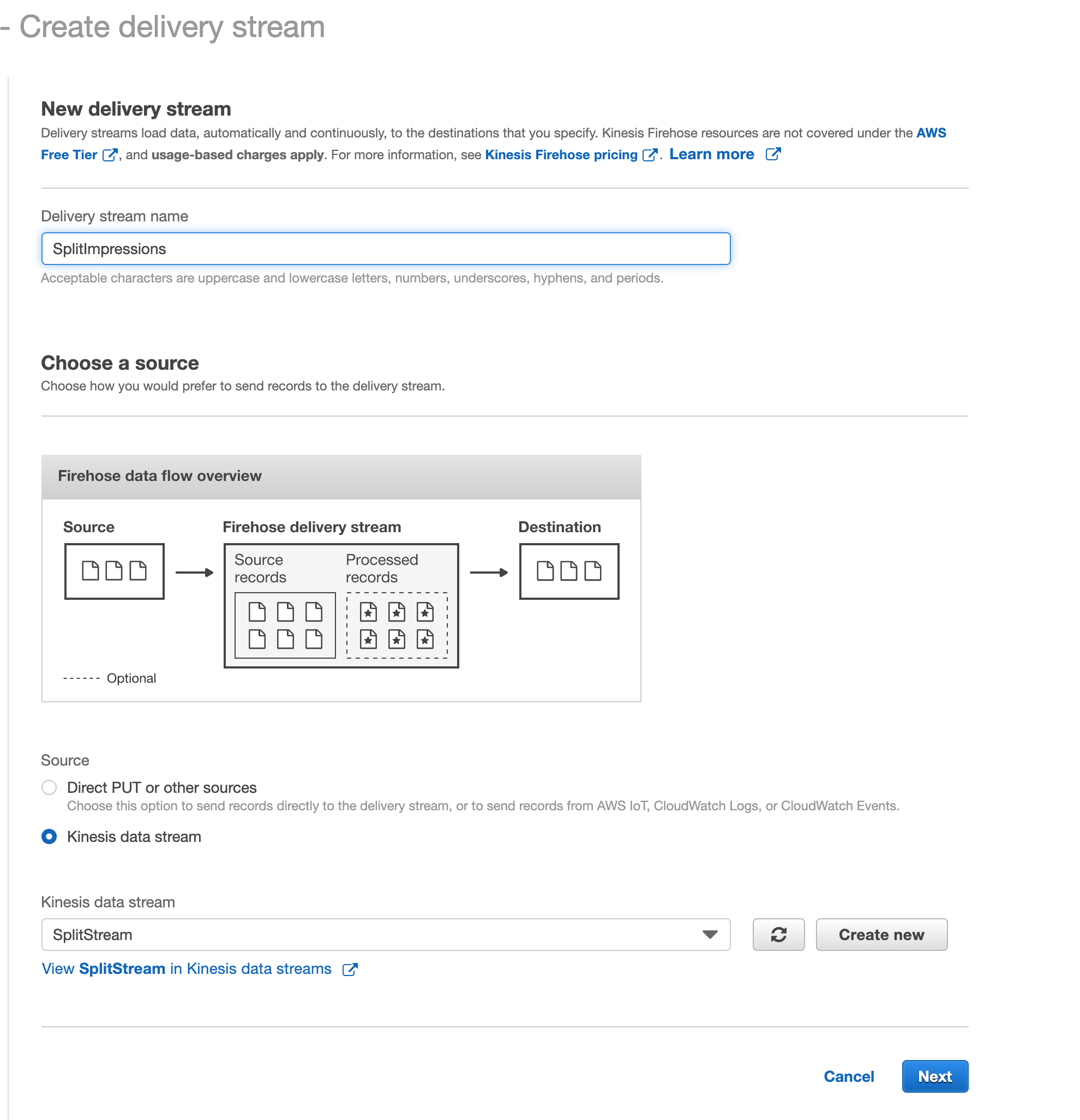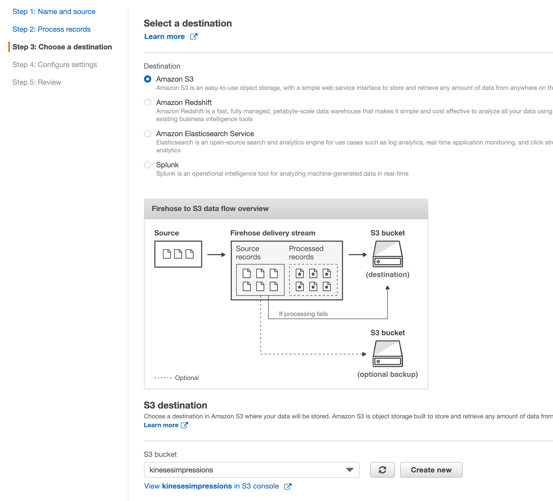 AmazonKinesisFullAccessandAmazonKinesisFirehoseFullAccesspolicy, click Next, then click Create delivery stream.
