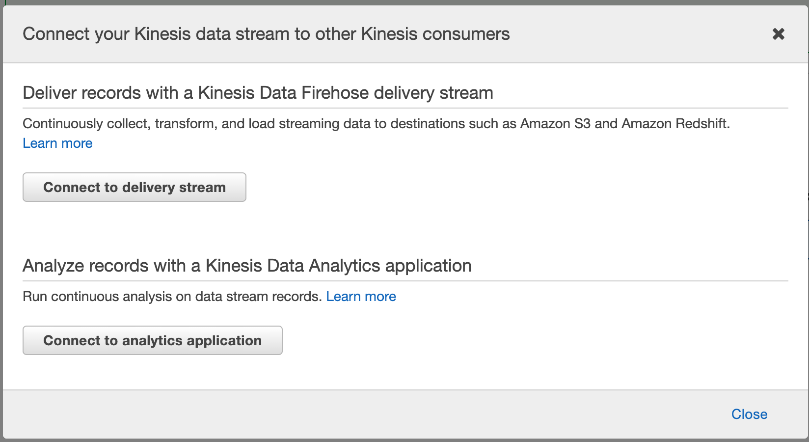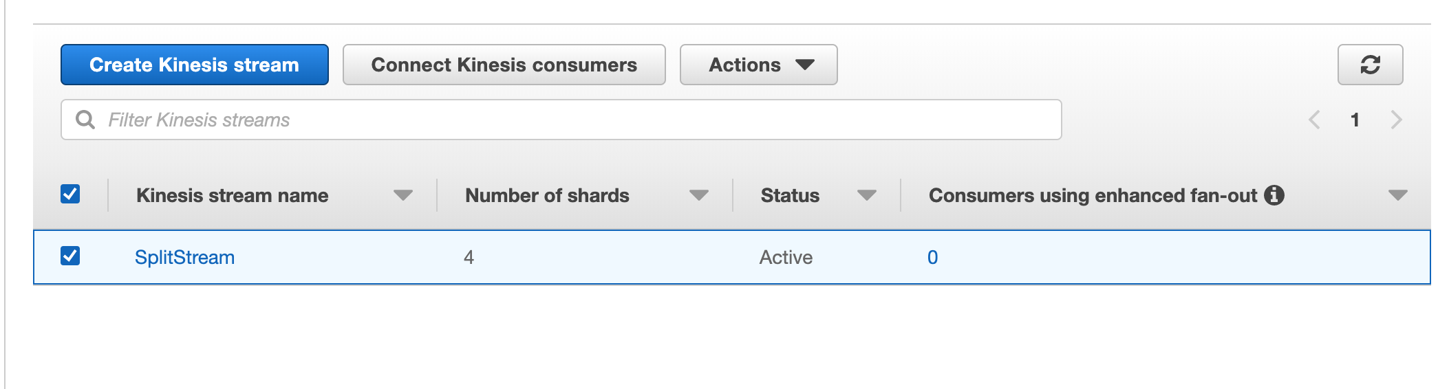 Once the Kinesis Stream is created, select its record and click Connect Kinesis consumers.