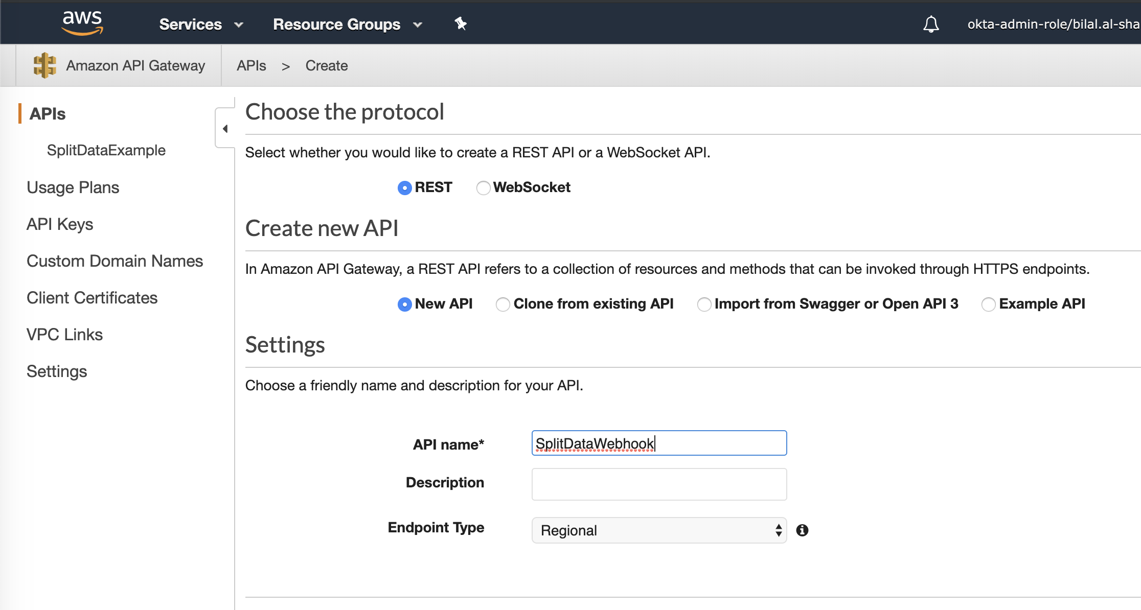 Rest APIandNew APIoptions, type a name for your API service, and click Create API.