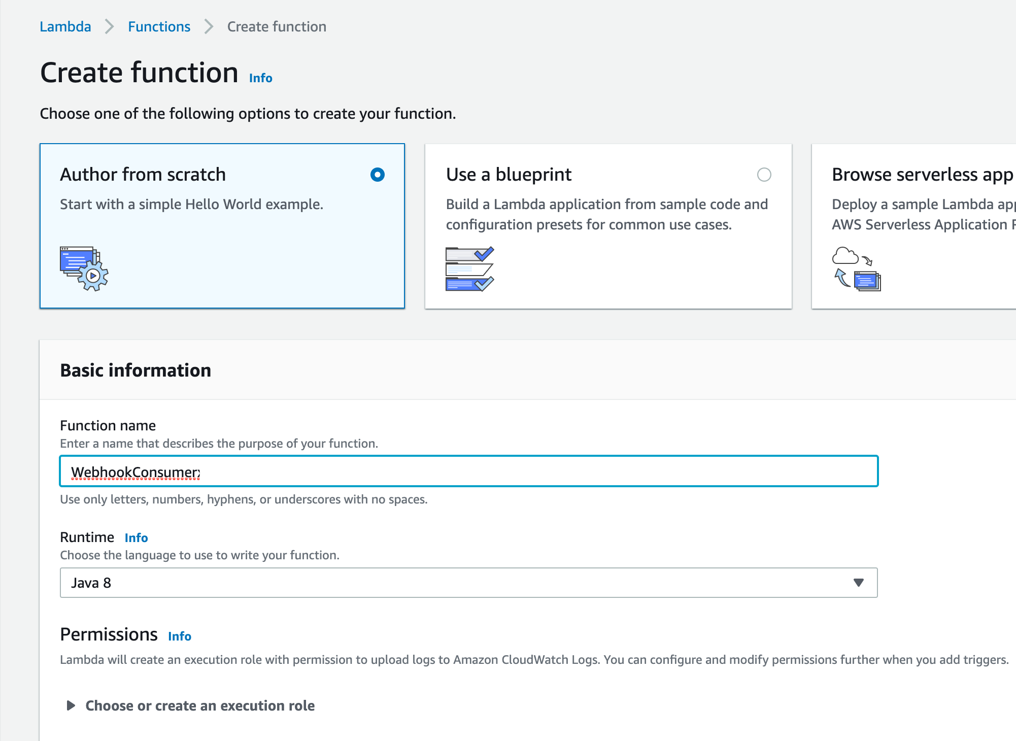 The Second service needed is AWS Lambda, select AWS > Lambda, click on the Create function button, choose the Author from scratch option, and use