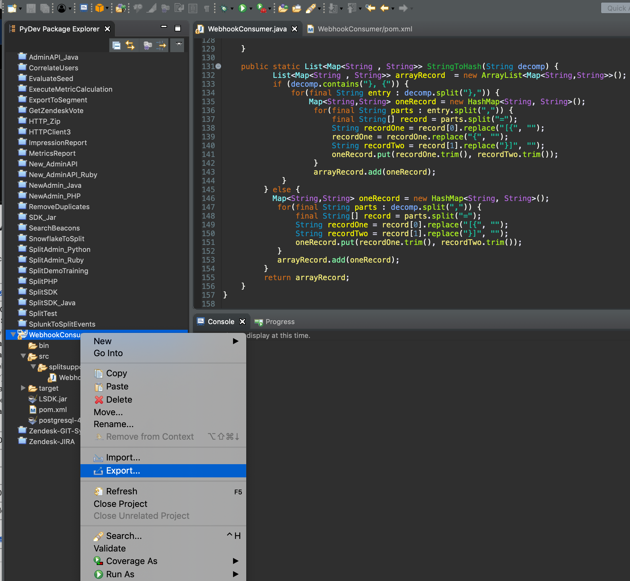 WebhookConsumer.java), make sure to replace theawsAccessKey,awsSecretKey,kinesisStreamName, andawsRegion. The code below will convert the JSON structure passed from the POST request to Dictionary objects, then loop through each Impression block and send a bulk post to the Kinesis Stream service.package splitsupport;