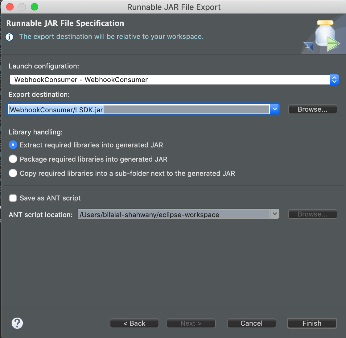 Select the Runnable JAR File option and click Next, then specify the JAR file name and click Finish.