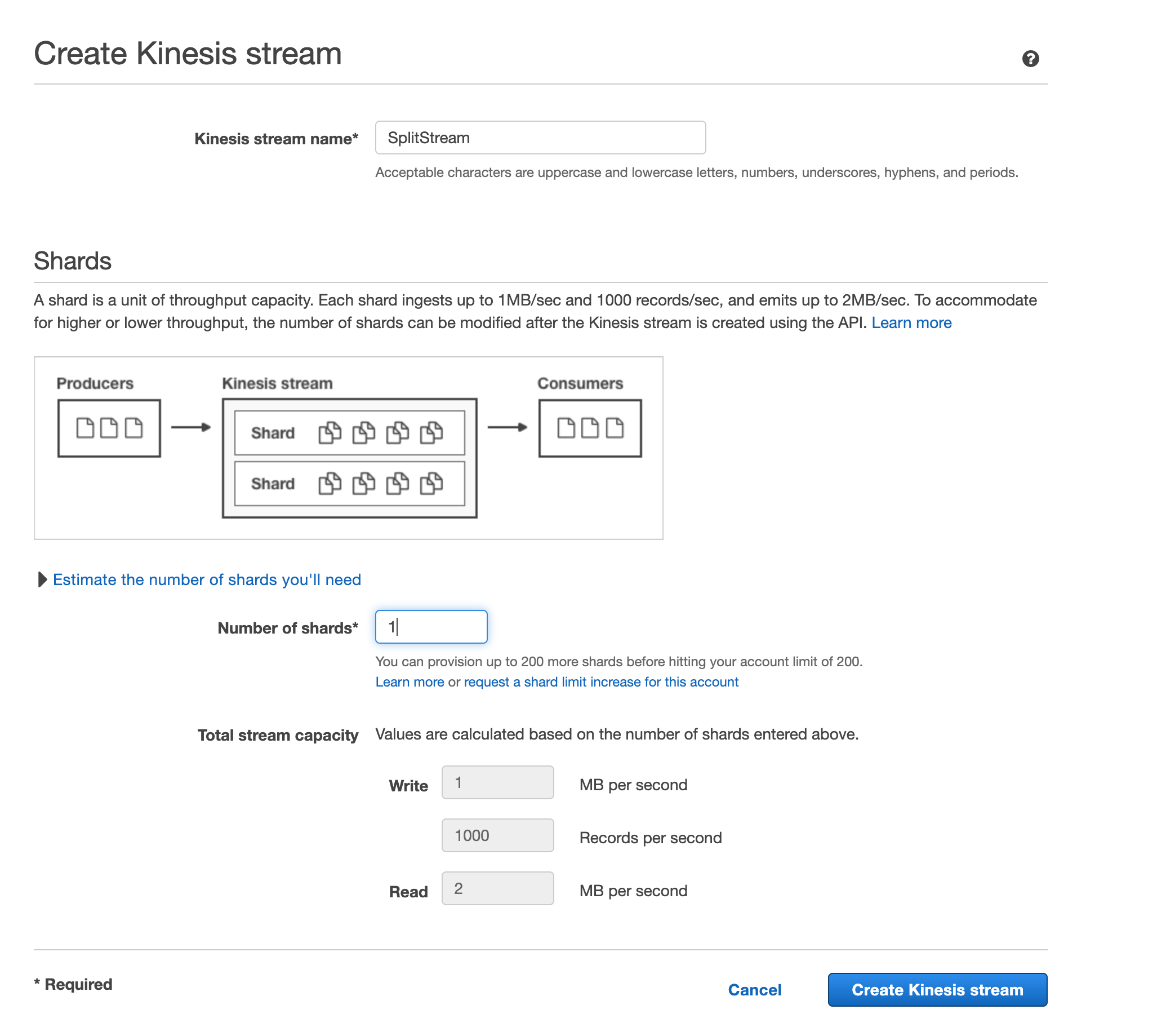 Put the service name, specify the shards number based on the amount of impressions generated, consult an AWS expert for more info on shards, and click Create Kinesis stream.