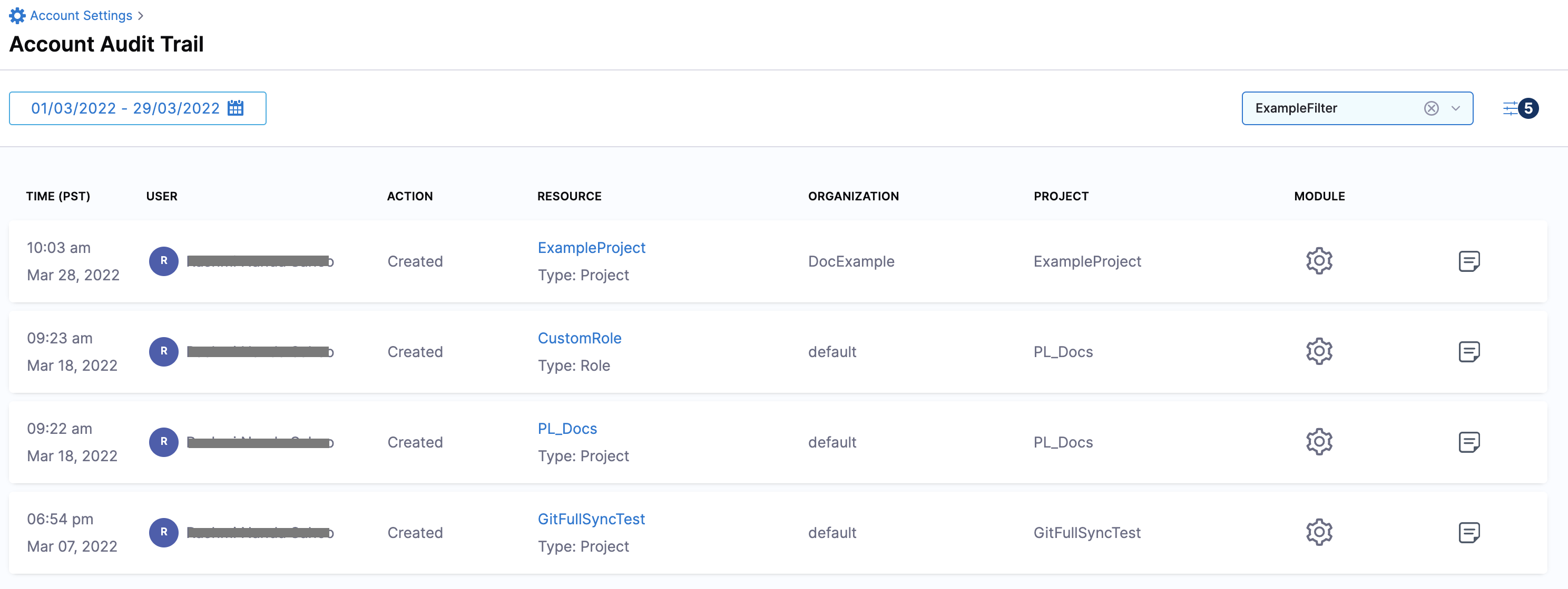 The Audit Trail page opens, displaying a record for each event that changed the setup of your Harness account, modules, or Harness entities. By default, Harness shows audit logs for the previous 7 days.