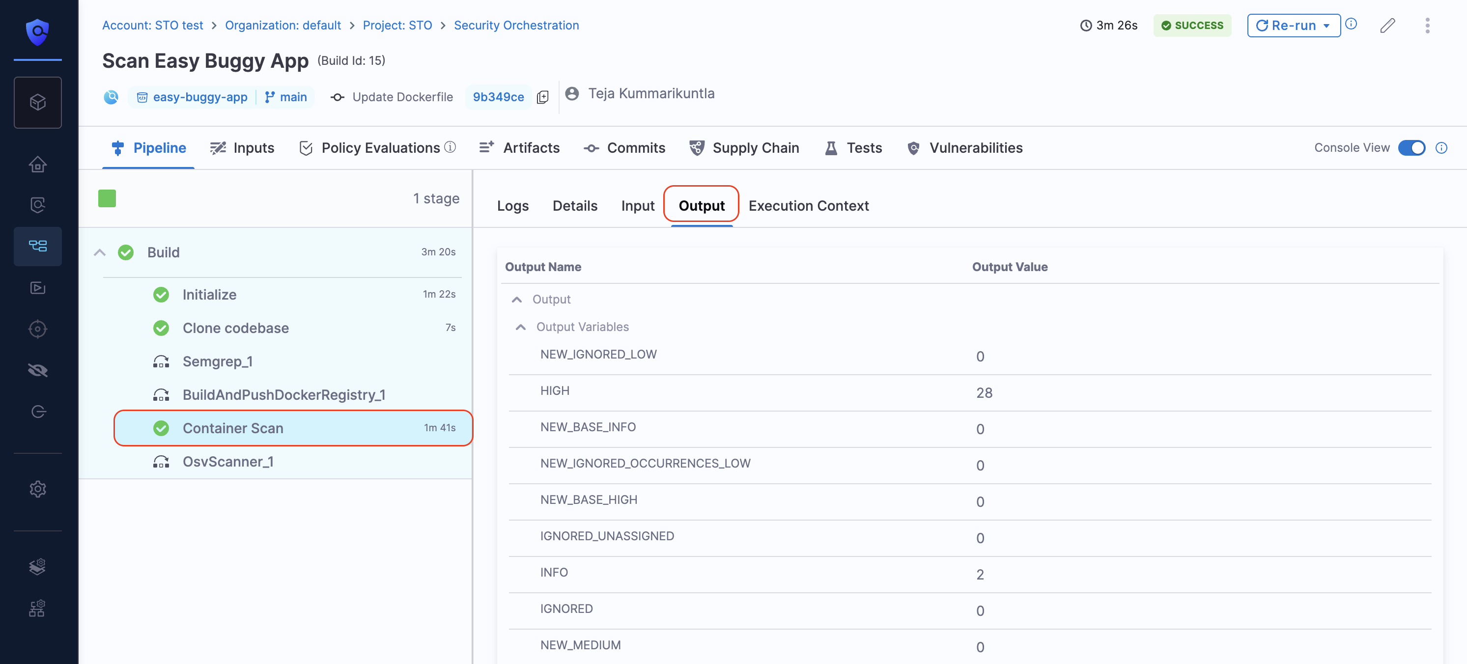 The scan step also adds vulnerability data specific to the base image and app layers in the step output variables of the scanner step in the pipeline execution window. For more details, see Output Variables for App and Base Image Vulnerabilities.